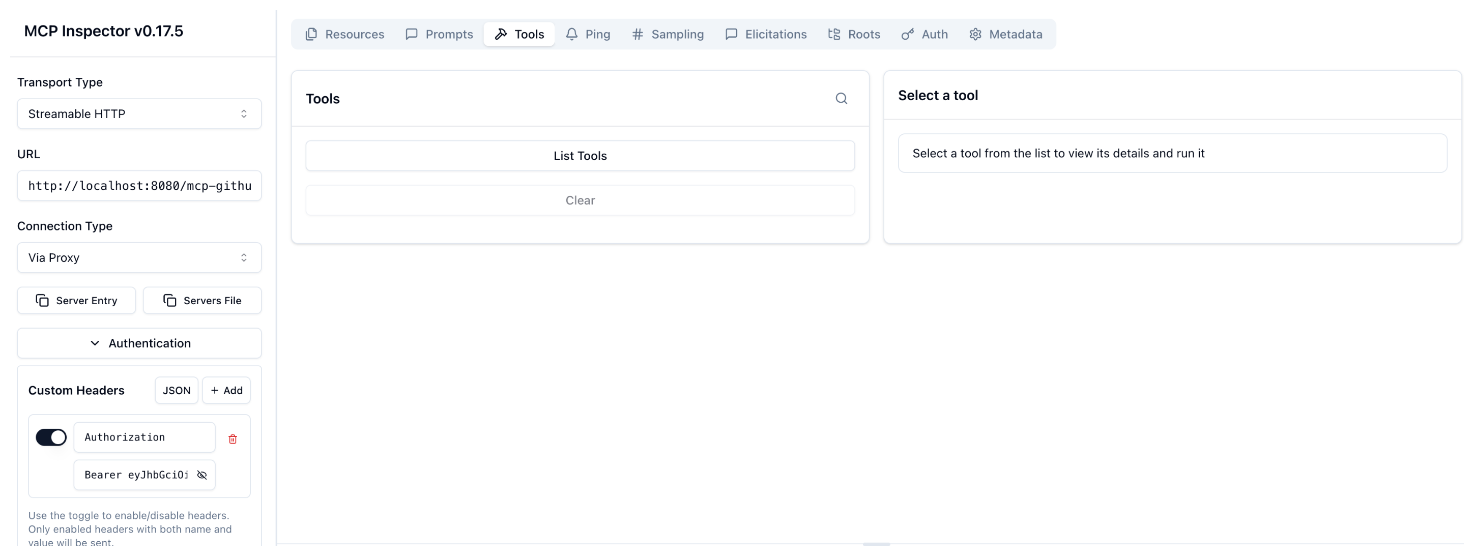 2. Go back to the MCP inspector tool. In the Authentication > Custom Headers card enter the JWT token for Bob. Then, click Re-connect.