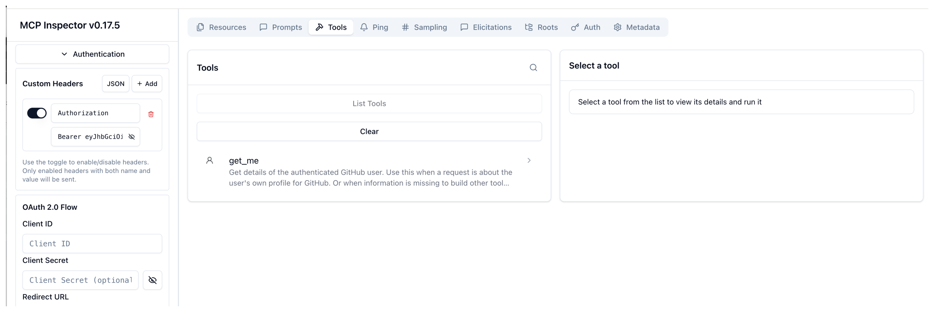 Verify that the connection succeeds and that you can successfully access the get_me tool.