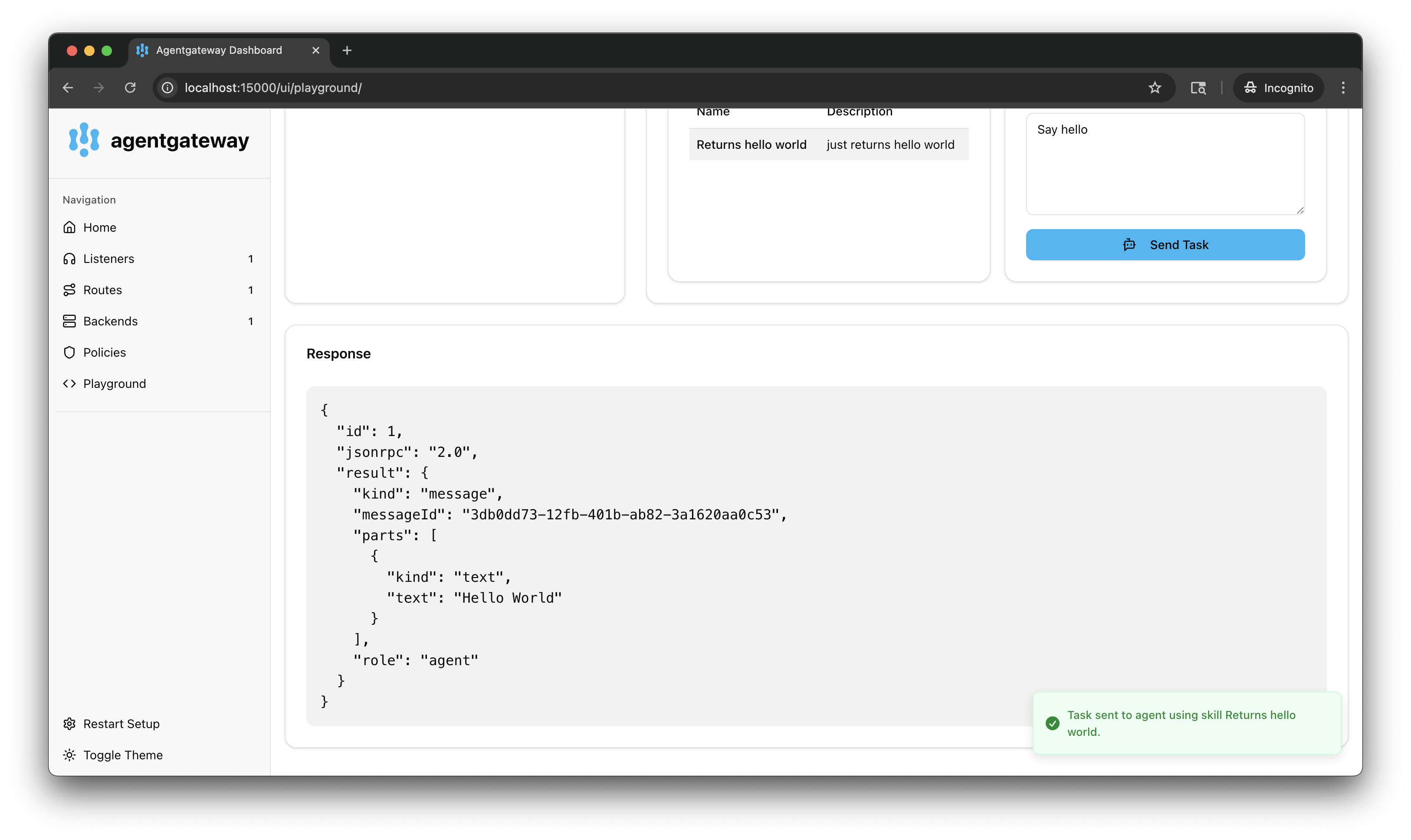 Hello Worldby taking a look at the end of the respond{"kind":"text","text":"Hello World"}],"role":"agent"} -